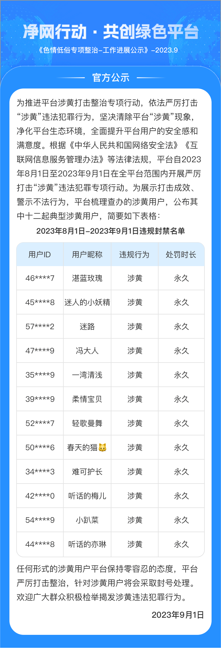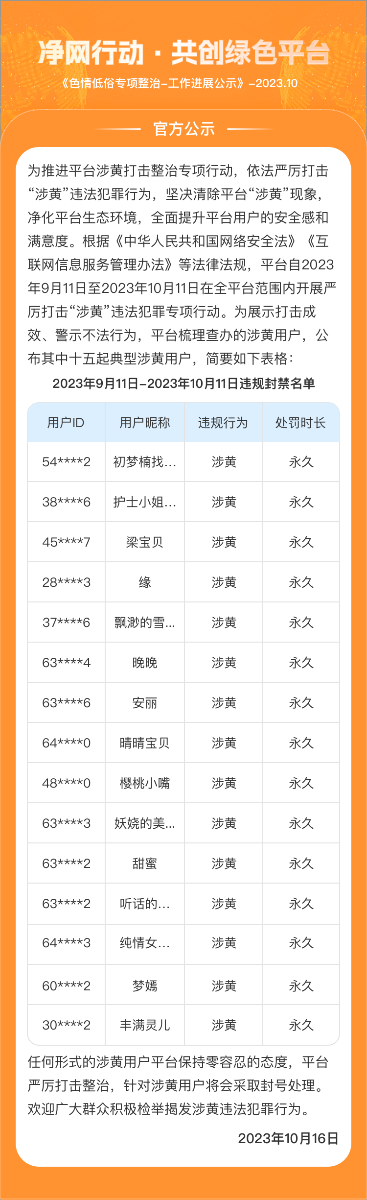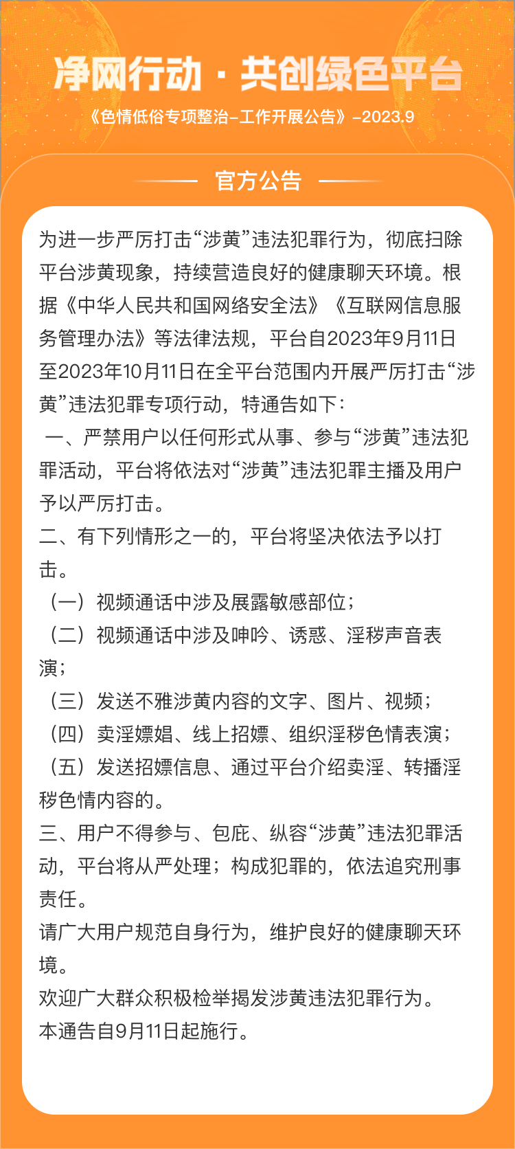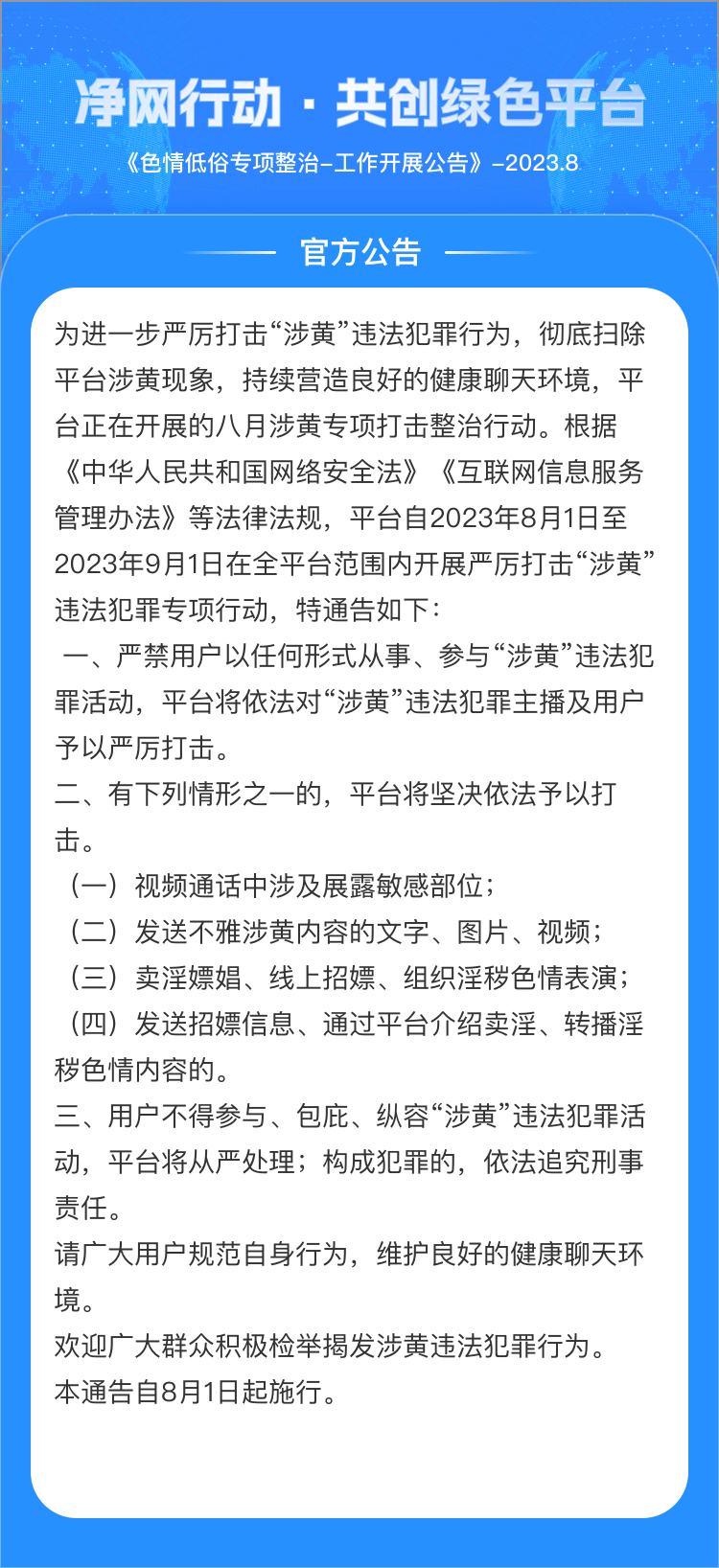 为进一步严厉打击“涉黄”违法犯罪行为,彻底扫除平台涉黄现象,持续营造良好的健康聊天环境,平台正在开展的八…