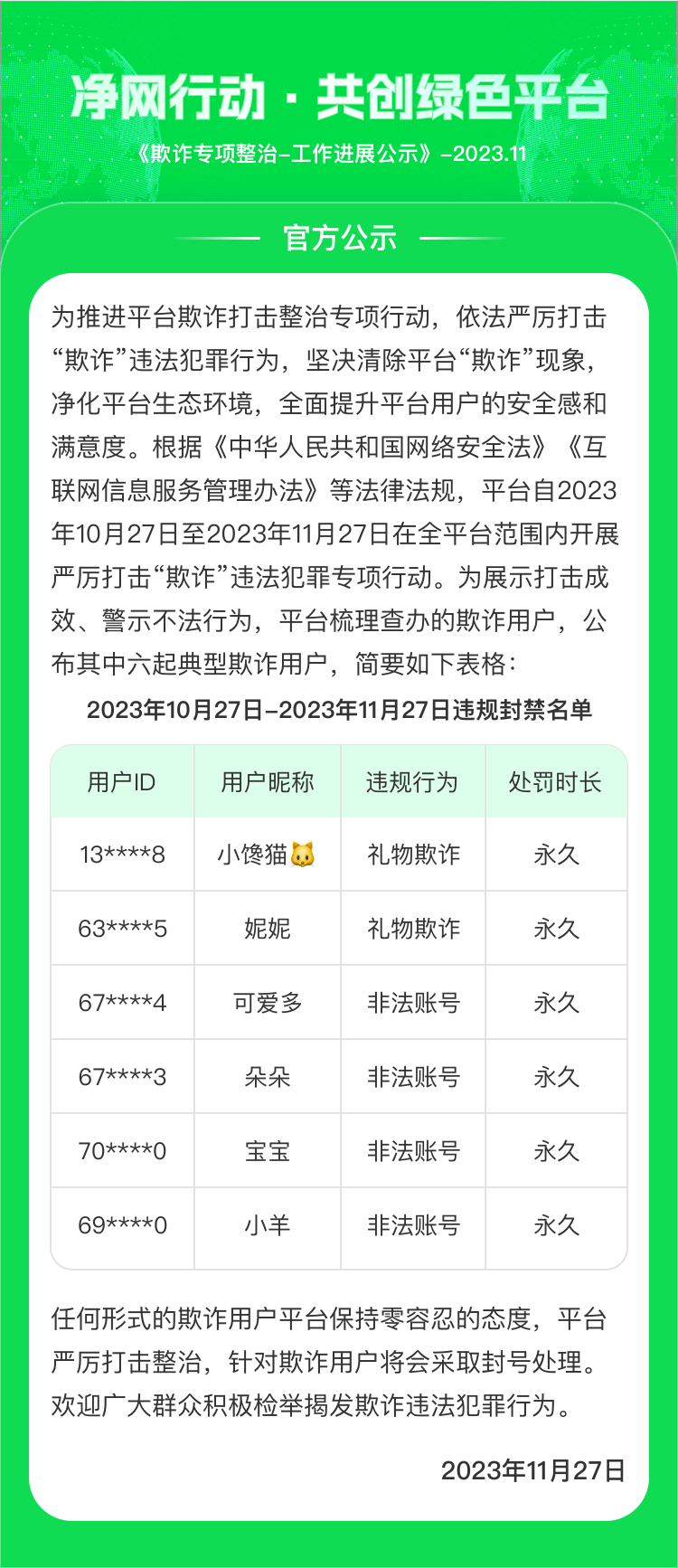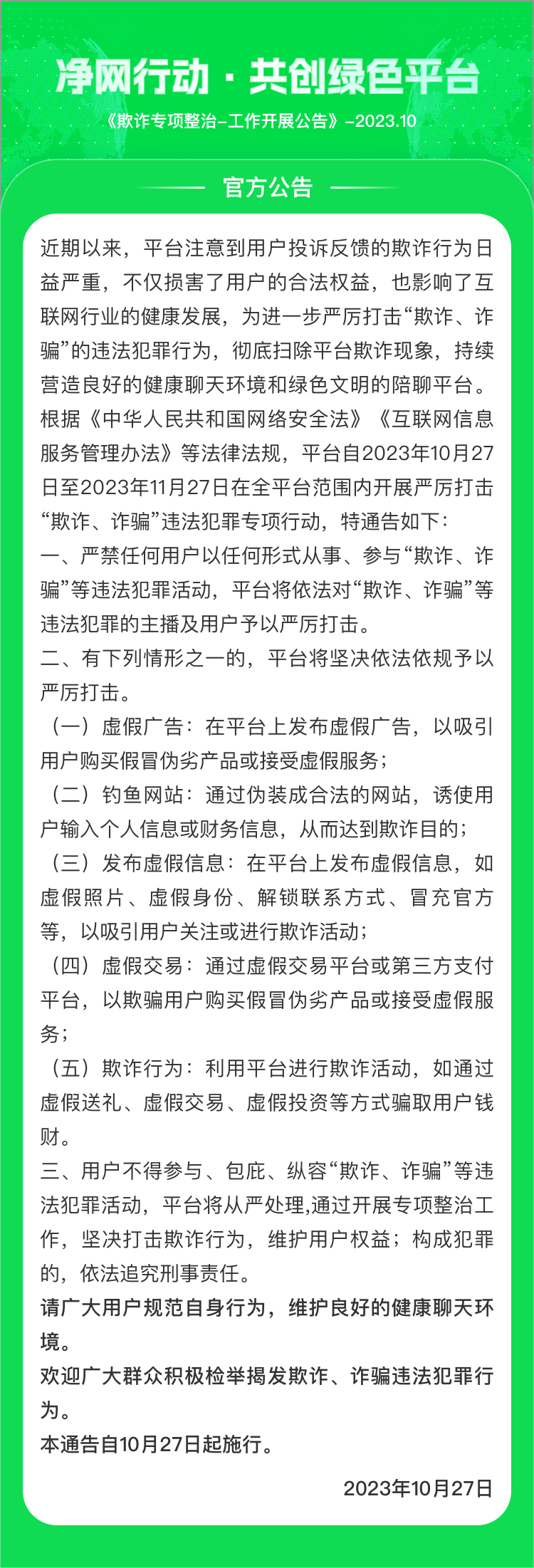 为坚决遏制违法违规行为在平台内的滋生蔓延,净化平台生态环境,切实保障用户财产安全与社交体验。根据《互联网…