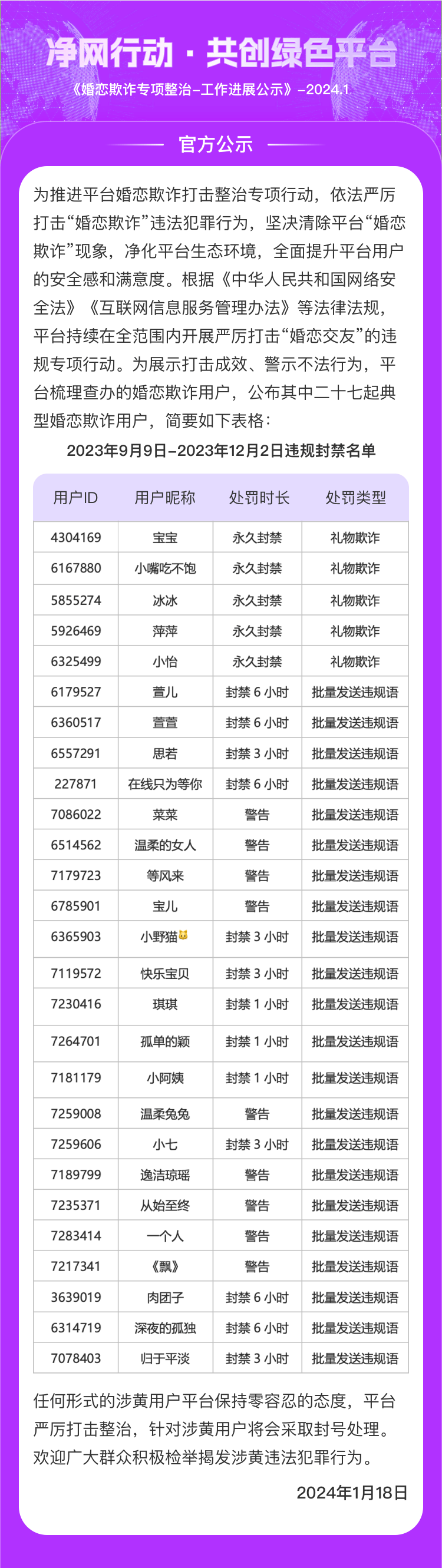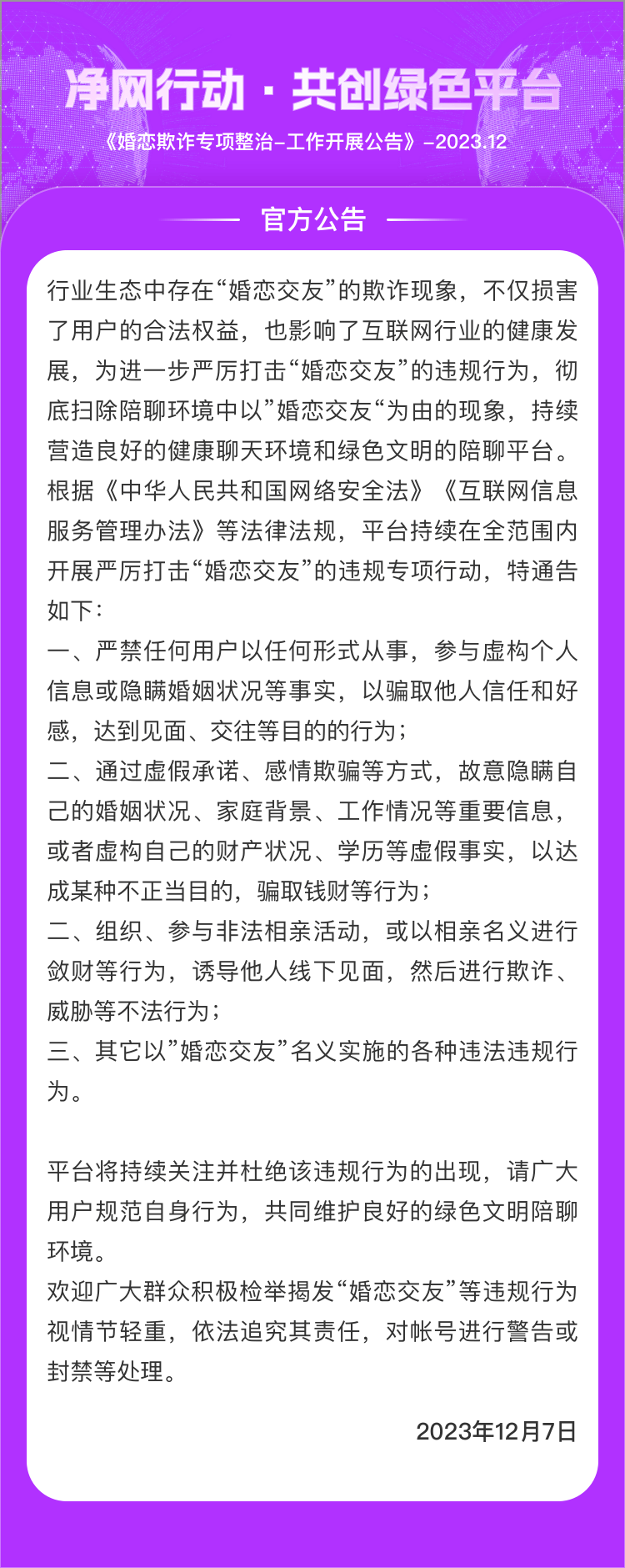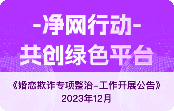 行业生态中存在“婚恋交友”的欺诈现象,不仅损害了用户的合法权益,也影响了互联网行业的健康发展,为进一步严…