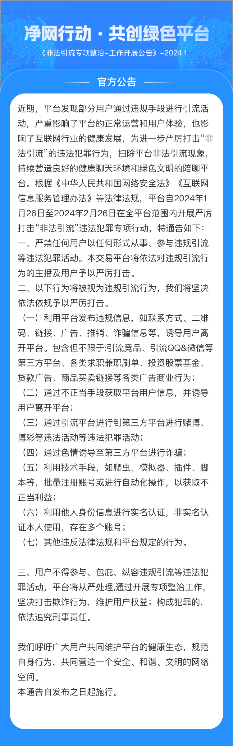 近期以来,平台注意到用户投诉反馈的欺诈行为日益严重,不仅损害了用户的合法权益,也影响了互联网行业的健康…